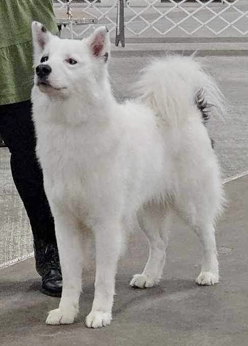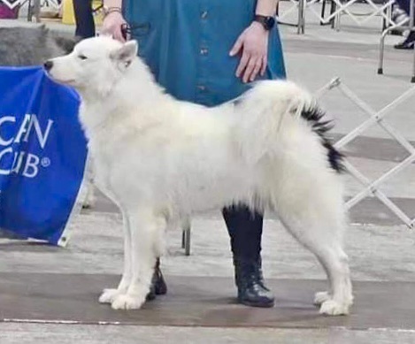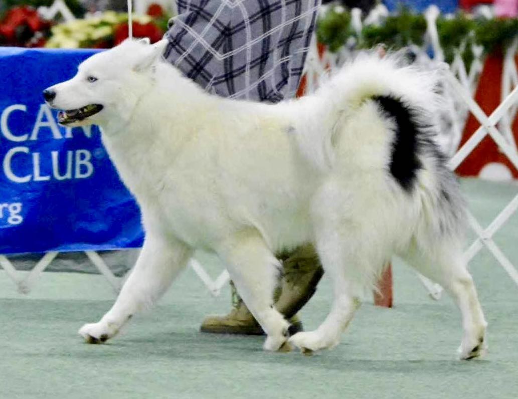 Bucky is an energetic, athletic dog, who is a stunning companion to his family. Bucky is the first Yakutian Laika to go Best of Breed at The National Dog Show. His temperament is goofy, biddable, and he is a friendly, outgoing pet.